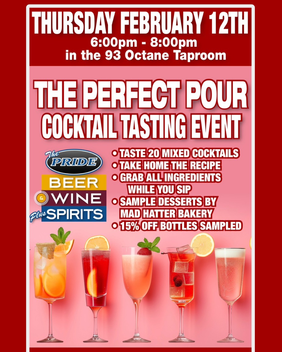 Join us as we search for the Perfect Pour! 🍸 We’re hosting a Cocktail Tasting on February 12 from 6–8 PM at The PRIDE Beer & Wine Plus Spirits—and you won’t want to miss it!